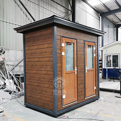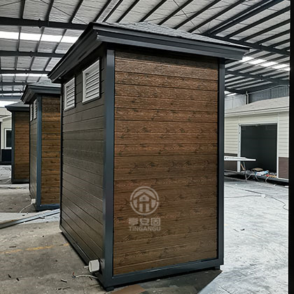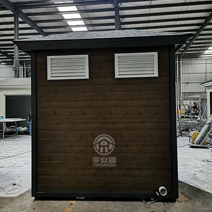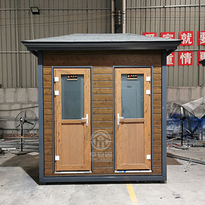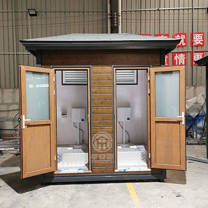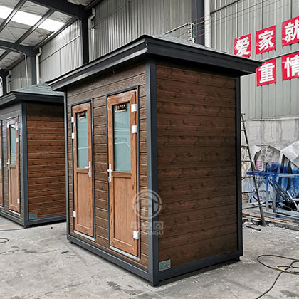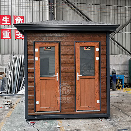 此款厕所尺寸2.4m*1.5m*3.1m高,墙体采用山东产优质仿木金属雕花板,结构坚固,是风景区移动厕所首选产品。